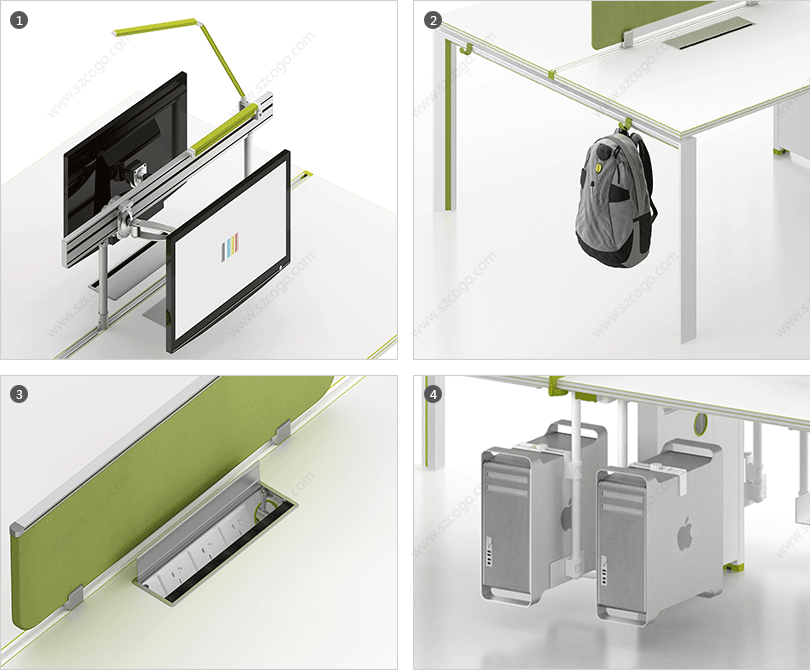 1、桌面屏风,多种选择:板材、玻璃、亚克力、吸音板、多功能挂槽。 2、超人性化设计,多功能挂件,收纳无处不在。