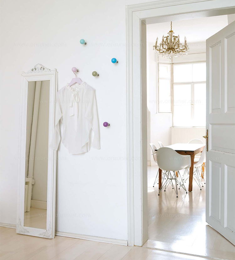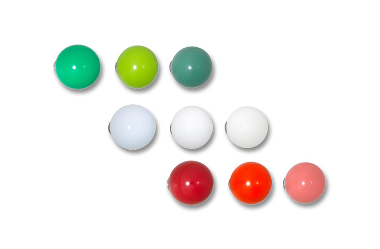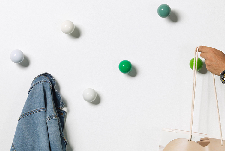 Hella Jongerius的Coat Dots安装在一个可伸缩的销钉上,可以稍微拉离墙壁,为夹克和衣架提供方便的挂钩。 同时,它们也可以简单地用作装饰墙元件。 涂层点有三种颜色协调的球,包括安装材料。