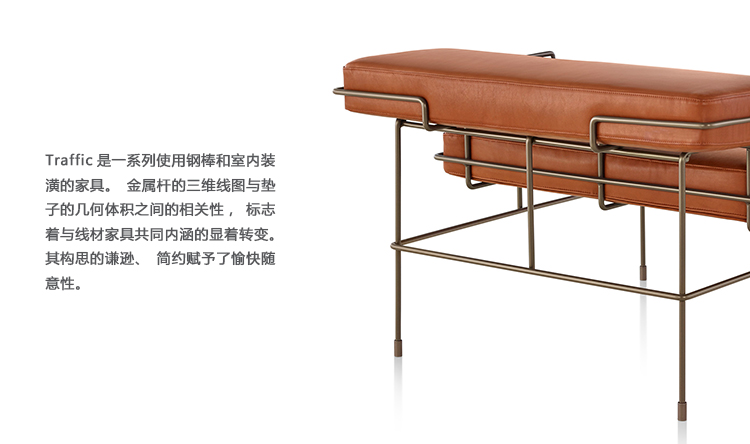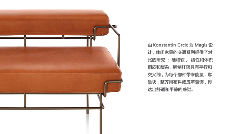 由Konstantin Grcic为Magis设计,休闲家具的交通系列提供了对比的研究:硬和软,线性和体积,俏皮和复杂。 钢制杆架具有平行和交叉线,为每个部件带来能量。 靠垫块,整齐地用布料或皮革装饰,传达出舒适和平静的感觉。