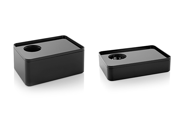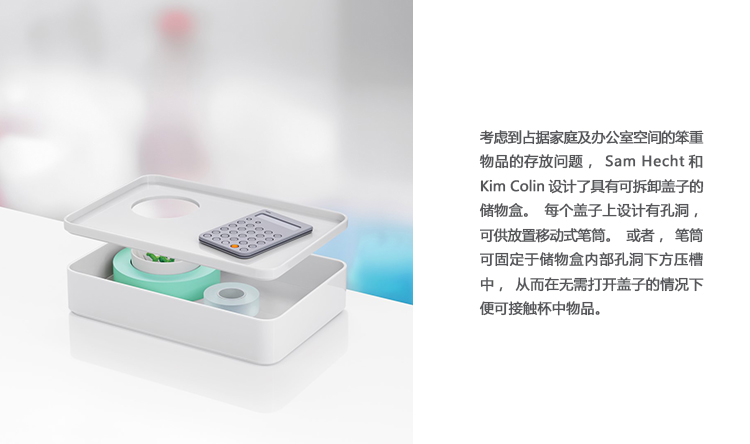 考虑到占据家庭及办公室空间的笨重物品的存放问题,Sam Hecht和Kim Colin设计了具有可拆卸盖子的储物盒。每个盖子上设计有孔洞,可供放置移动式笔筒。或者,笔筒可固定于储物盒内部孔洞下方压槽中,从而在无需打开盖子的情况下便可接触杯中物品。