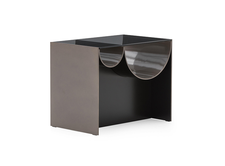 波浪咖啡桌是由一种烟熏的灰色玻璃制成的,它由一种漆成的铝结构支撑着,外面是一种沙子或浅青铜色的色调,里面有一种淡黄色的色调。