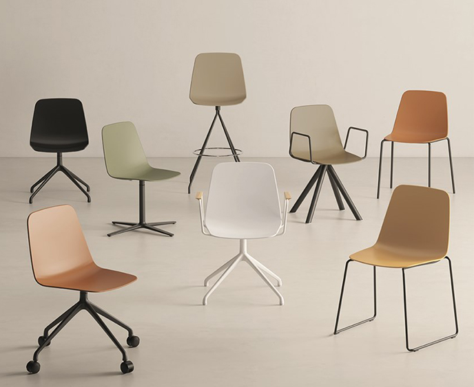 这种新的椅子的版本保持菱形的座椅是自2012年以来在该系列中看到的Maarten系列的特征。增加的功能包括各种基座(四条腿,雪橇,旋转,金字塔,轮式......),并且可以选择堆叠其中一些,非常好共享空间的附加价值。