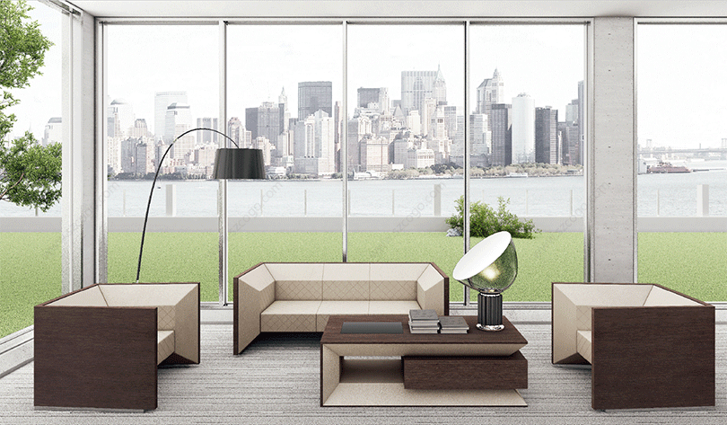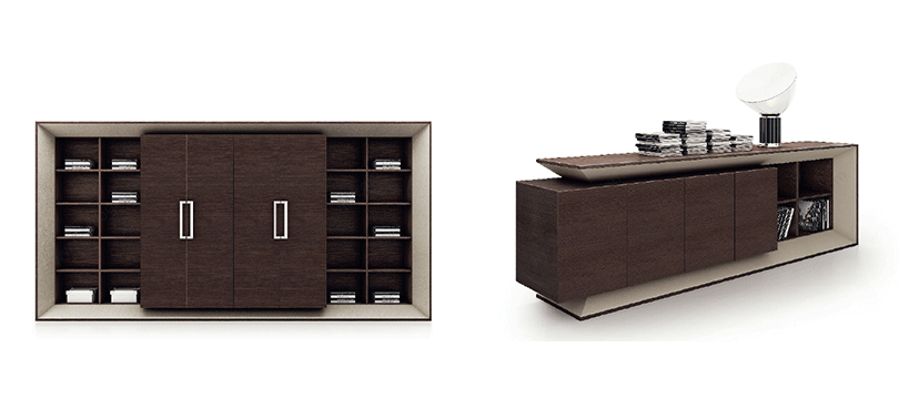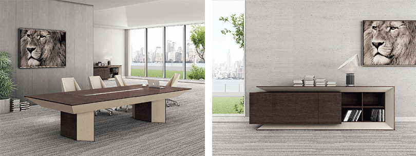 格朗系列,灵感来源于法国巴黎的地标建筑“新凯旋门”,整个设计的给人稳重厚实视觉效果,寓意着深深扎根于土地。新凯旋门的45度斜角边是这套家具系列的主要设计元素,简单明朗的几何图形,厚重的顶部与底部,并通过使用深色表达出来厚重和稳重。系列配套沿袭班台的风格,独特的切割面与流畅的线条感,错落有致布置在整个空间内。铁刀木色与白色皮质形成不一样的视觉效果,表现出独特的纯净与凝练,勾勒一种现代独立的风格。"