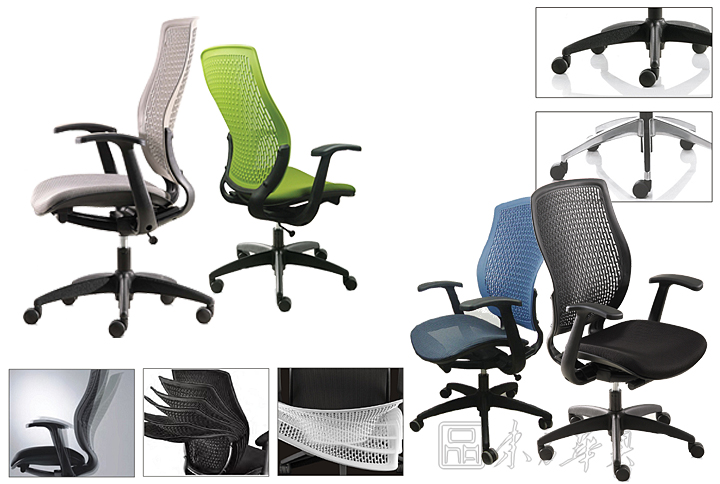 椅背:采用高张力网布,具有透气性强、弹力强及不助燃等特点。背框,靠背,腰靠:采用尼龙塑胶模出,环保,防助燃;材质靭性强并富有弹力,不易脆