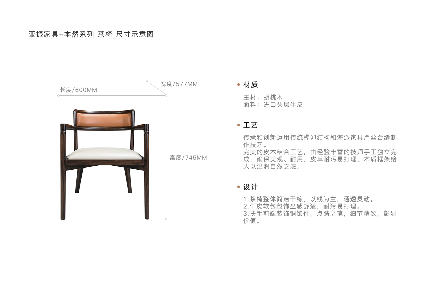 1.茶椅整体简洁干练,以线为主,通透灵动。 2.牛皮软包包饰坐感舒适,耐污易打理。 3.扶手前端装饰铜饰件,点睛之笔,细节精致,彰显价值。