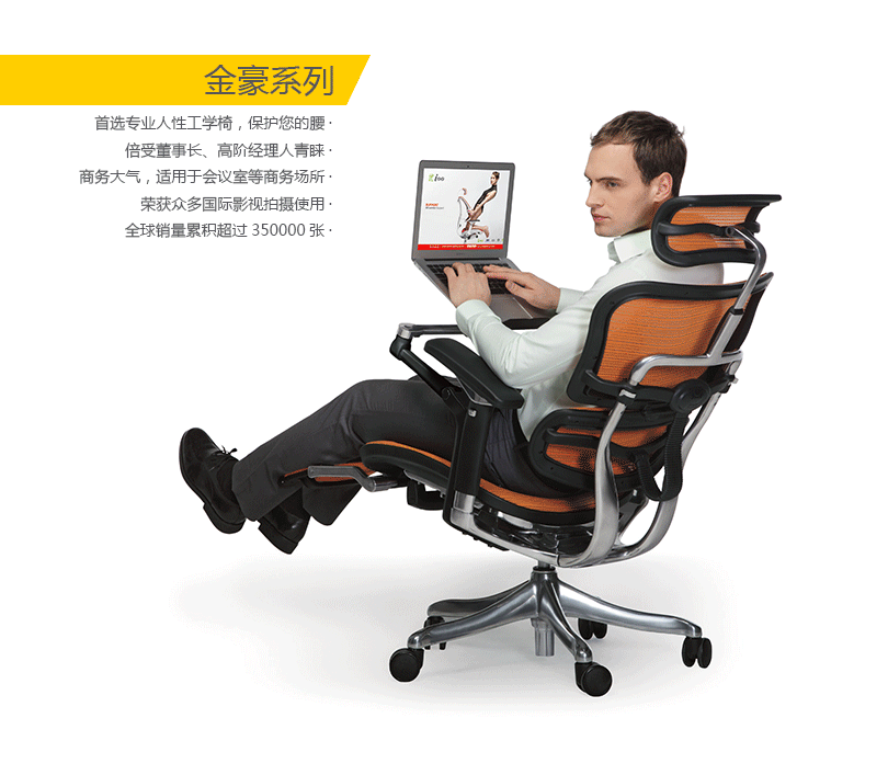 首选专业人性工学椅,保护您的腰;倍受董事长、高阶经理人青睐;商务大气,适用于会议室等商务场所;荣获众多国际影视拍摄使用;全球销量累积超过350000张。"