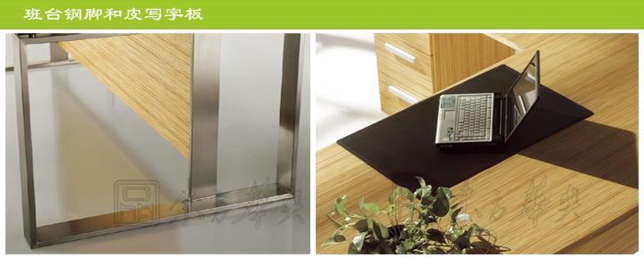 ※ 上图为大班台细节展示图,不锈钢拉丝脚架,实木挡板组合,移动皮革写字板,可选配线盒,舒适,清爽的办公环境,方便快捷的提高着工作效率。