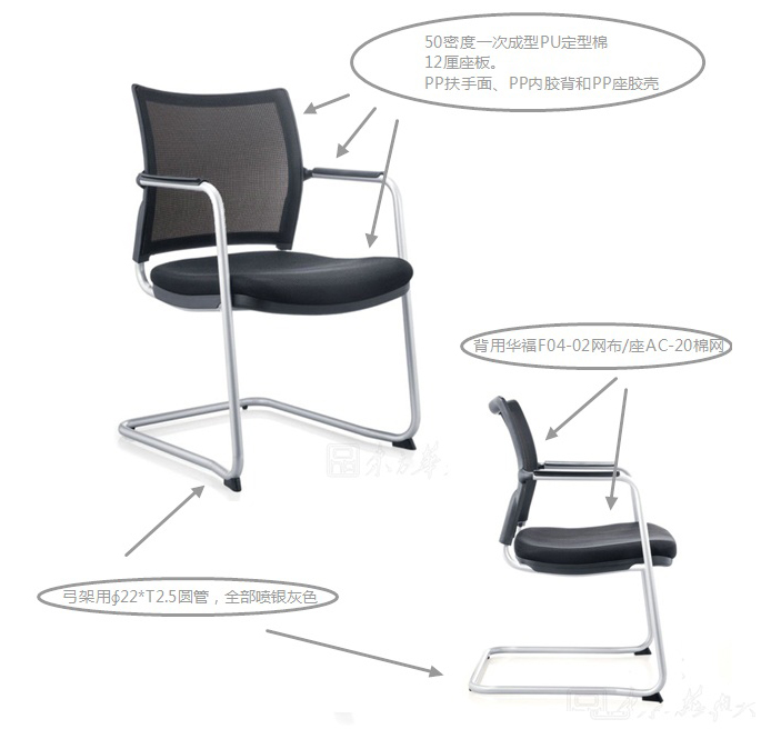 座胶壳,弓架用∮22*T2.5圆管,全部喷银灰色,背用华福F04-02网布/座AC-20棉