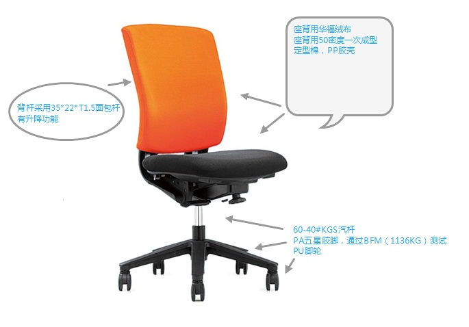 B:座背用50密度一次成型定型棉,PP胶壳,用60-40#KGS汽杆,PA五星胶脚,通过