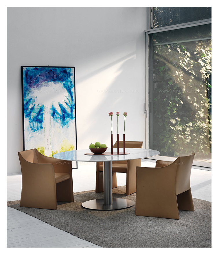餐桌采用缎面或哑光漆面不锈钢制成,白色或无烟煤色,顶部采用macroter或光面漆木,所有颜色,天然橡木,雕像大理石。 底座完全可拆卸,顶部可以是圆形或方形。