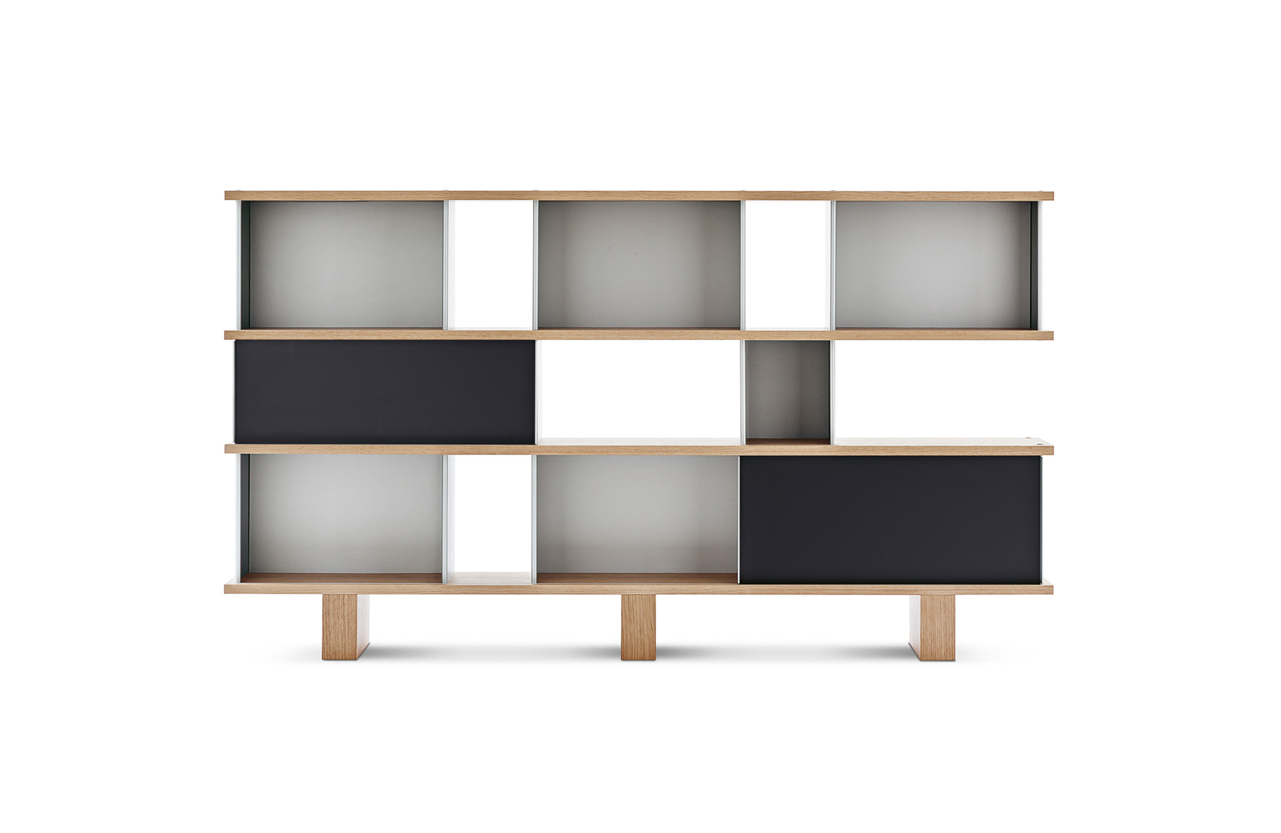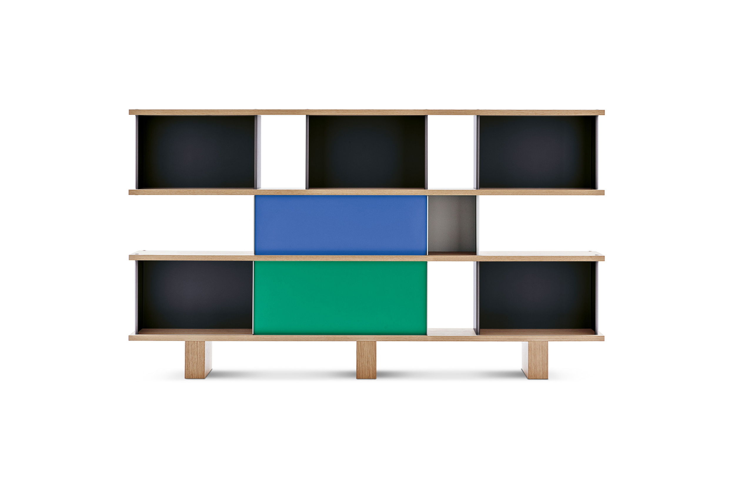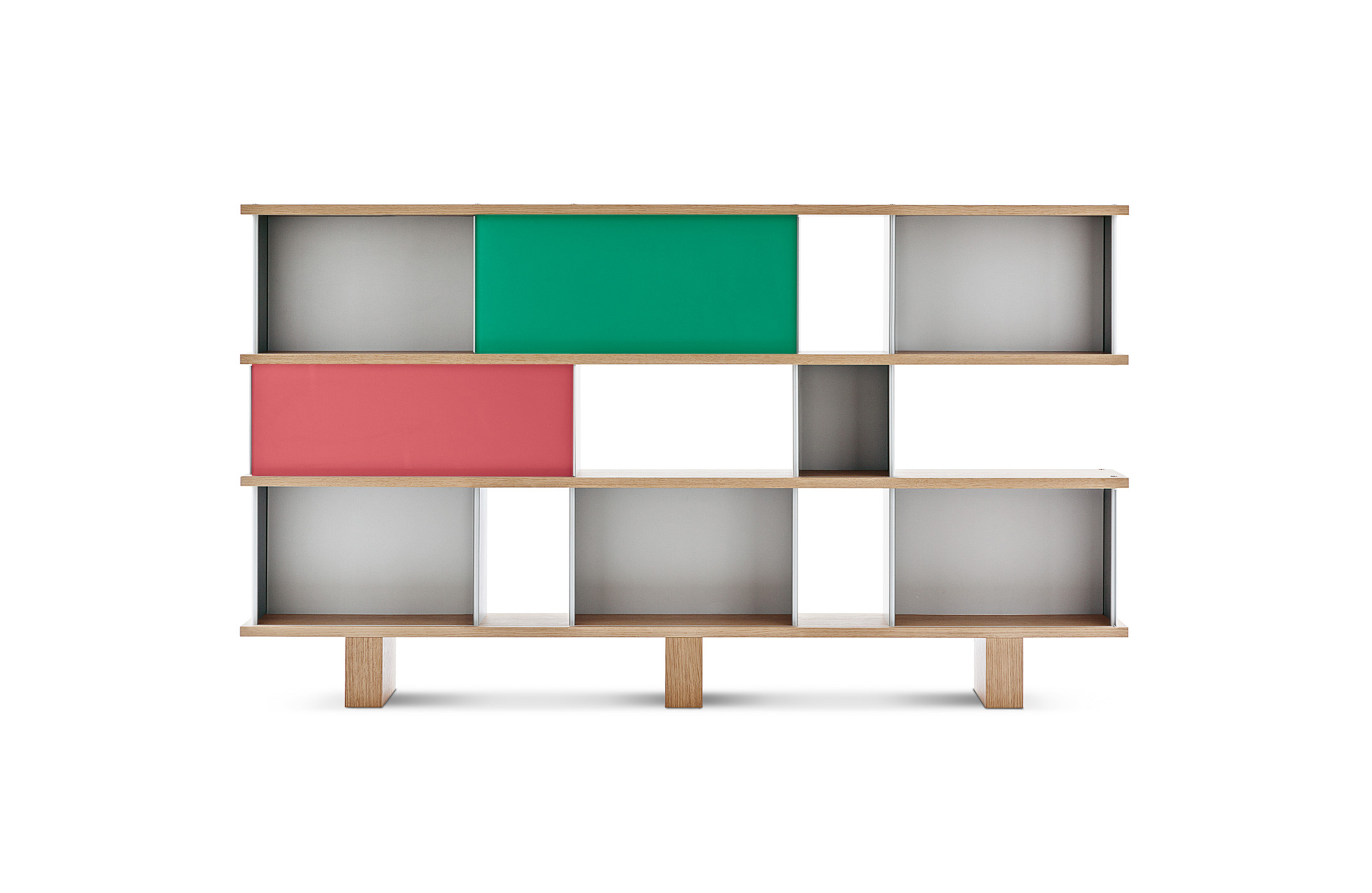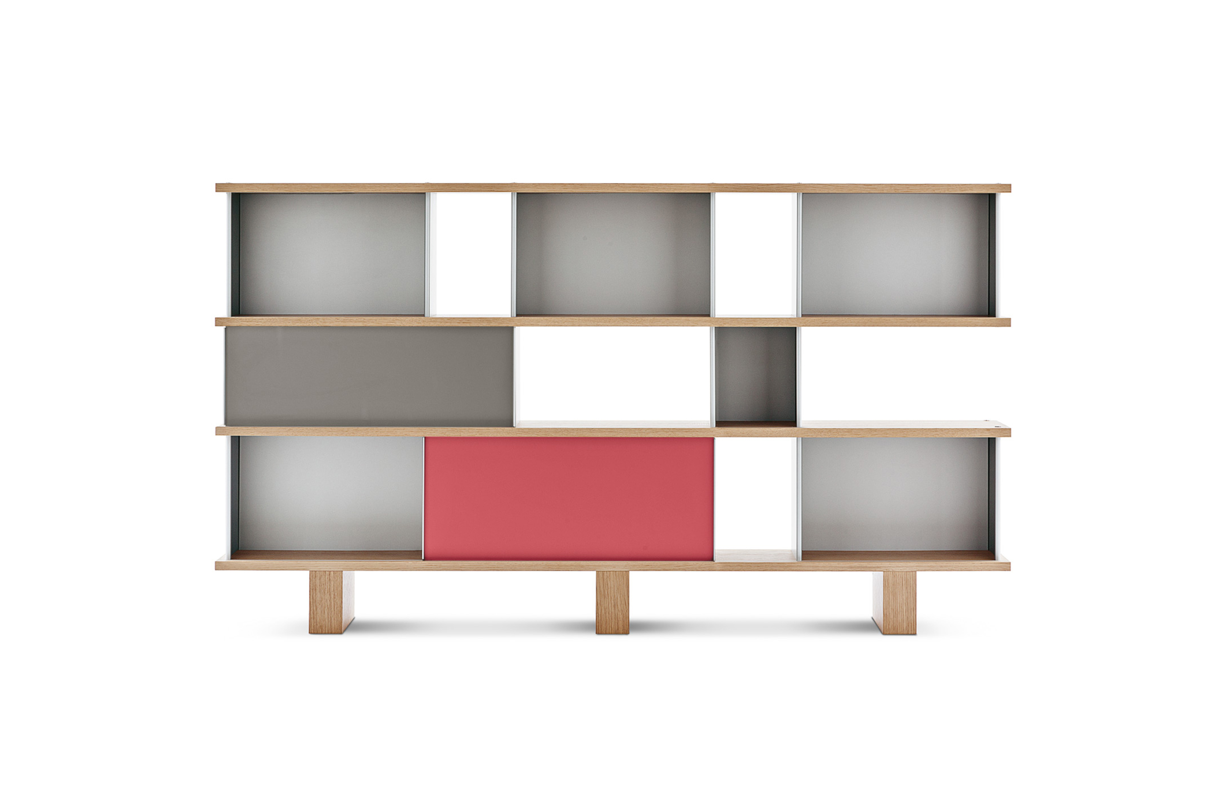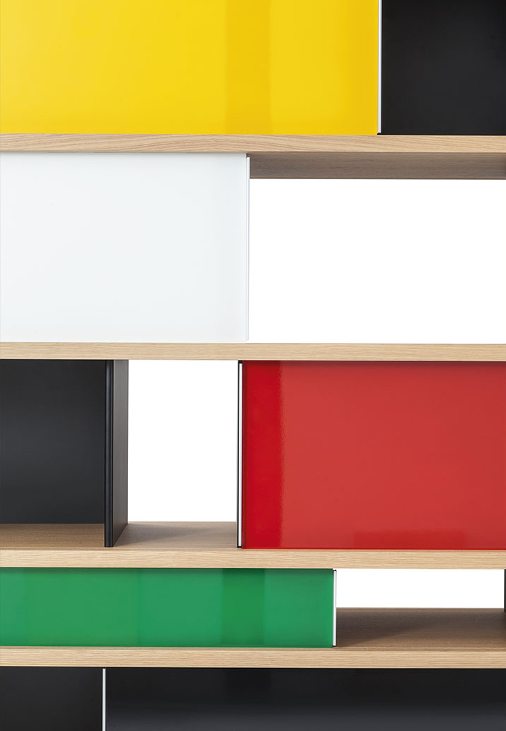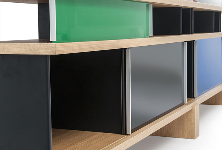 该系列包括餐边柜、碗柜和书架等,采用地面支撑或对称及非对称悬架,还包括与空间建筑风格相匹配的独立式书柜。基本单元组件为橡木搁架,阳极处理或黑色漆面的铝质单元。包括5种不同的高度,以实现物品和书籍不同风格的最佳布置。每种家具都配有附件,如铝盘等。书架滑轨采用阳极氧化铝、红色、蓝色、绿色、黄色、灰色、白色或黑色漆面。这款模块化书架由Charlotte Perriand设计,结构化处理运用巧能生精。对女设计师来说,每个模块结构并非一个单纯的块面,经过玩味地组合能有让人欣喜的效果。这件作品高度表现了Perriand在家具设计上的先锋精神,其对建筑艺术性、居住性,生活的信仰。