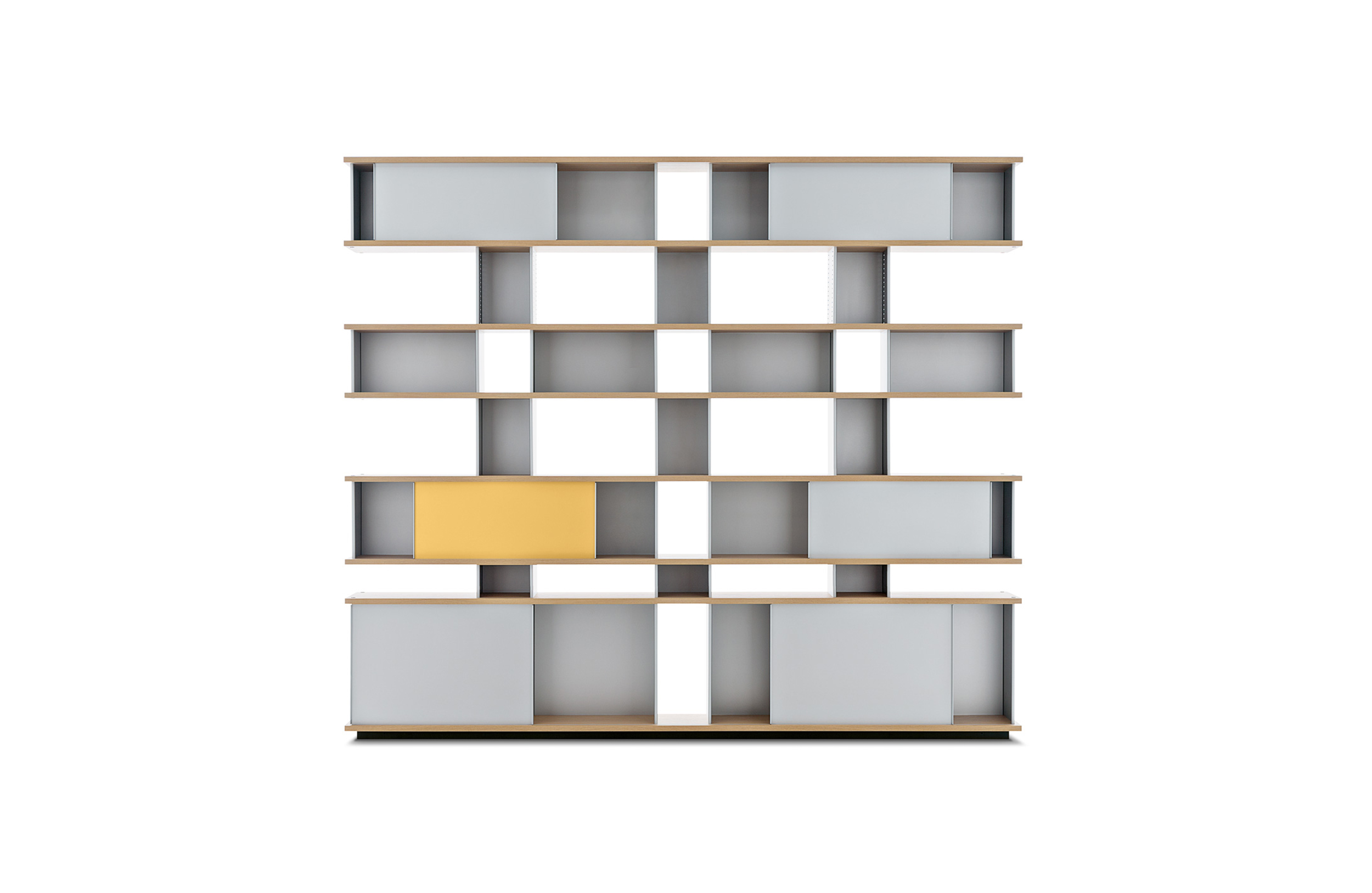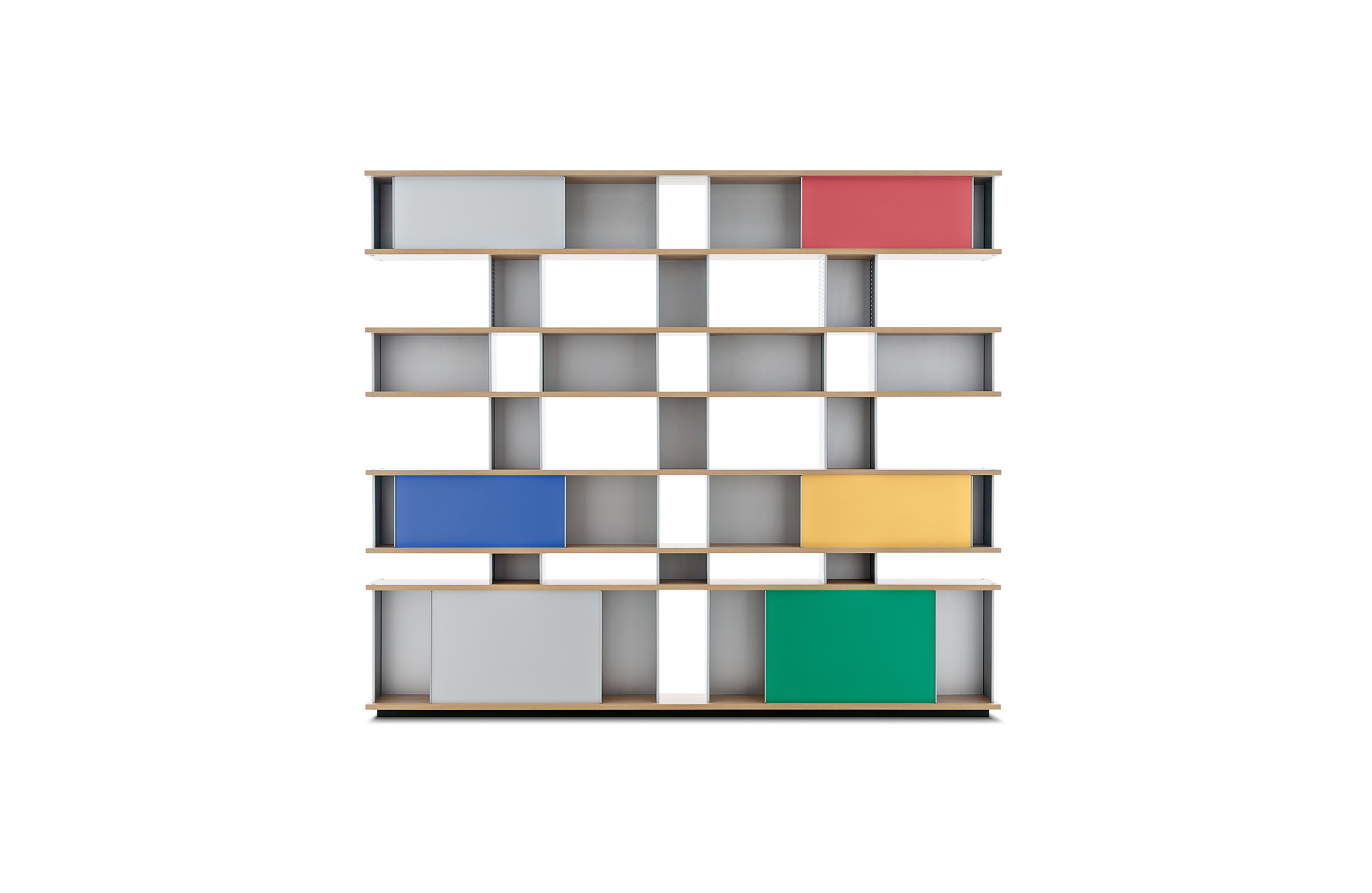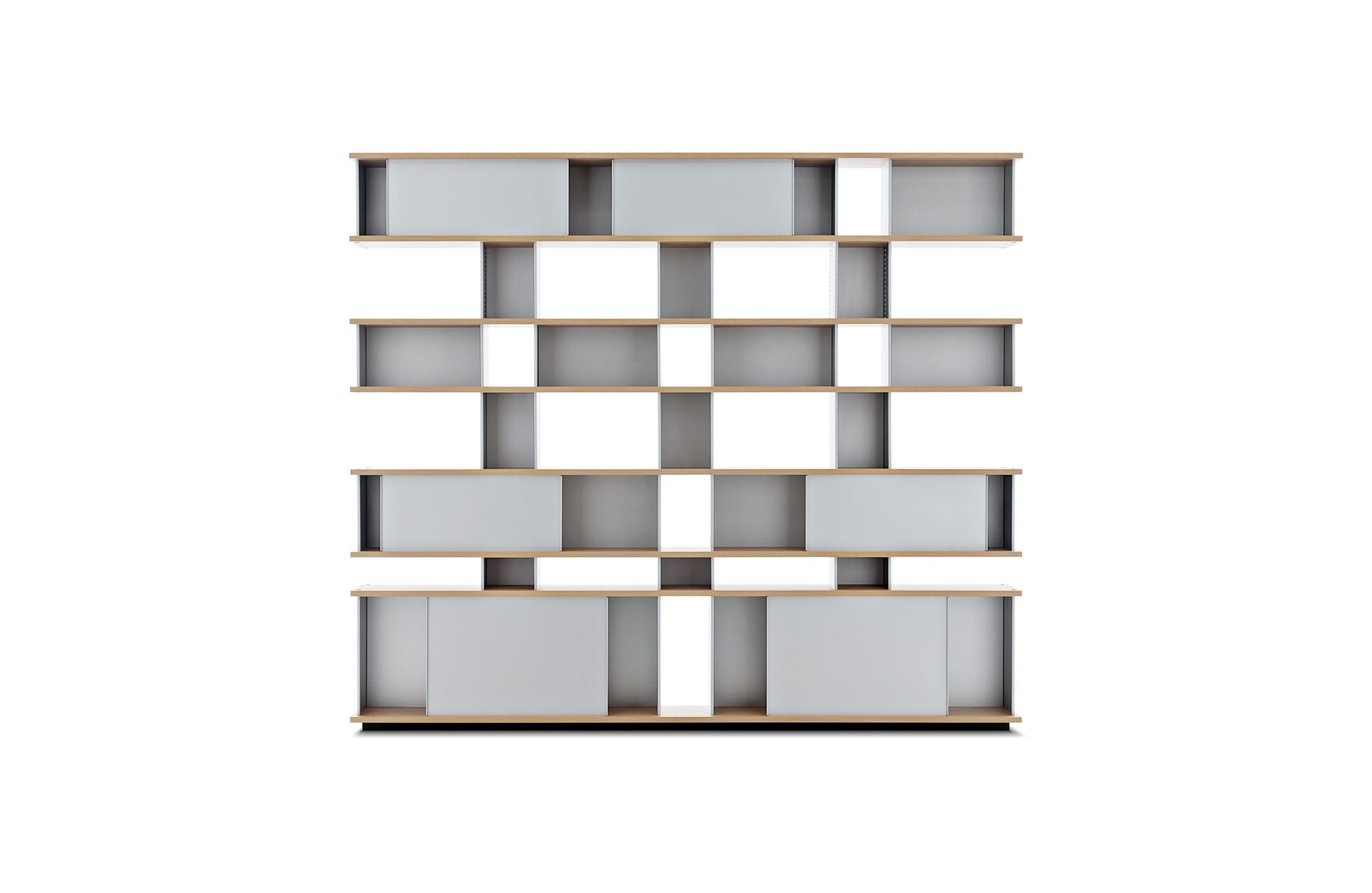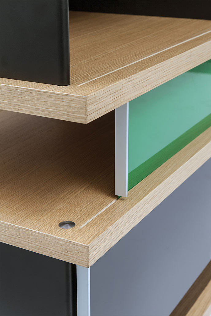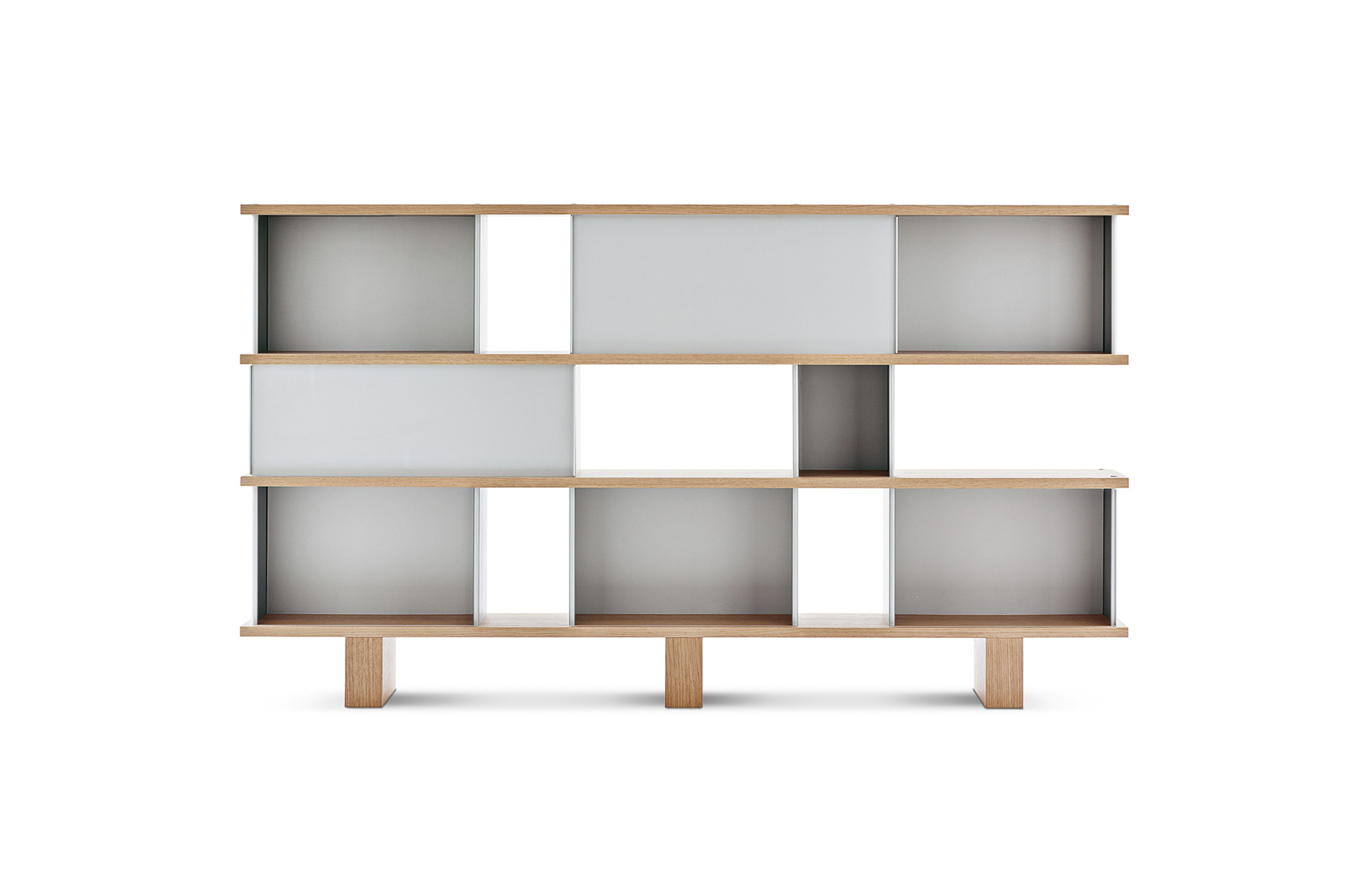 该系列包括餐边柜、碗柜和书架等,采用地面支撑或对称及非对称悬架,还包括与空间建筑风格相匹配的独立式书柜。基本单元组件为橡木搁架,阳极处理或黑色漆面的铝质单元。包括5种不同的高度,以实现物品和书籍不同风格的最佳布置。每种家具都配有附件,如铝盘等。书架滑轨采用阳极氧化铝、红色、蓝色、绿色、黄色、灰色、白色或黑色漆面。这款模块化书架由Charlotte Perriand设计,结构化处理运用巧能生精。对女设计师来说,每个模块结构并非一个单纯的块面,经过玩味地组合能有让人欣喜的效果。这件作品高度表现了Perriand在家具设计上的先锋精神,其对建筑艺术性、居住性,生活的信仰。