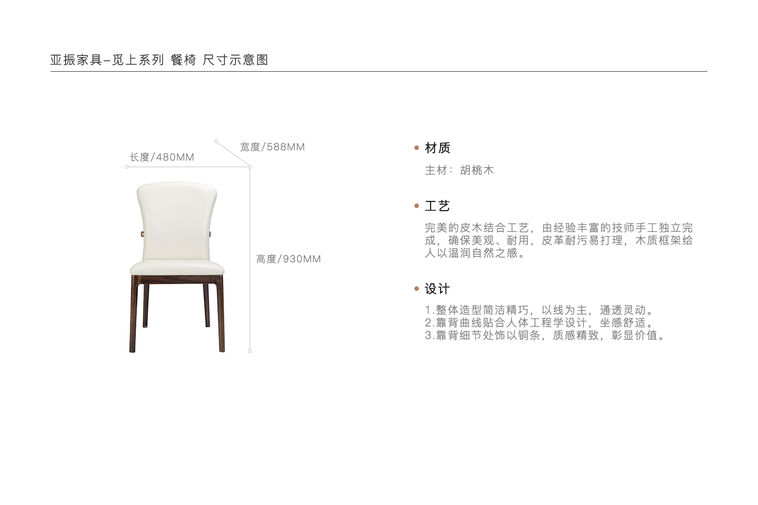 1.整体造型简洁精巧,以线为主,通透灵动。 2.靠背曲线贴合人体工程学设计,坐感舒适。 3.靠背细节处饰以铜条,质感精致,彰显价值。