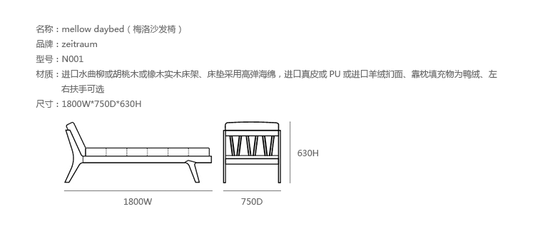 德国家具厂牌 ZEITRAUM 讲究的不仅仅是家具,它着重的是一种"生活态度",每件 ZEITRAUM 家具除了需具备实用、耐用、容易搭配的基本要件,更重要的是可以衬托用户与空间的个性,简约取代夸张花俏的线调,细腻精巧的做工低调传递设计师缜密的设计思维。ZEITRAUM 使用来自永续森林的落叶型硬木,表面以有机油/蜡涂装,完全不使用化学物质,让用户与家具在空间自由呼吸。mellow daybed(梅洛沙发椅),由丹麦设计工作室Formstelle设计,水曲柳或胡桃木或橡木实木床架、床垫采用高弹海绵,高级真皮或PU或羊绒扪面、靠枕填充物为鸭绒、左右扶手可选。