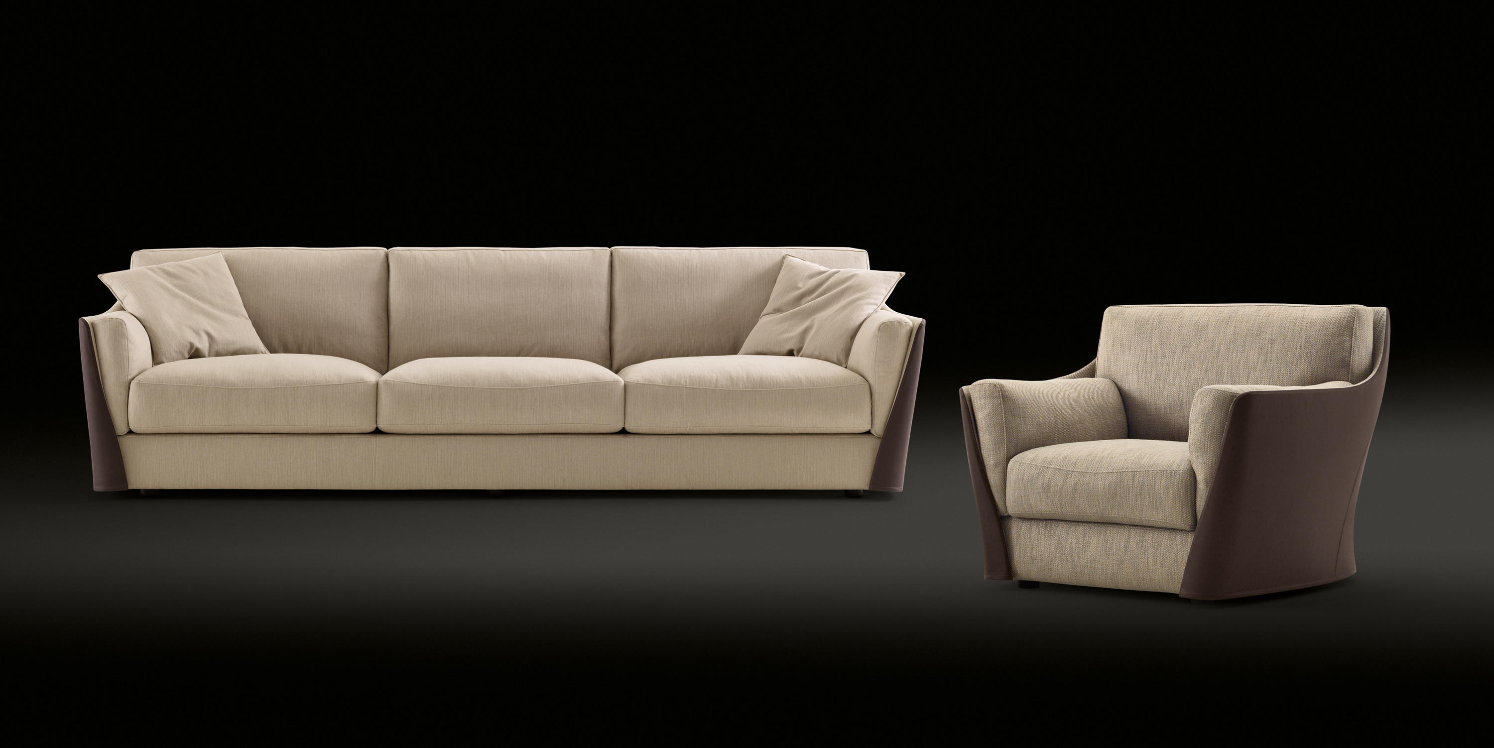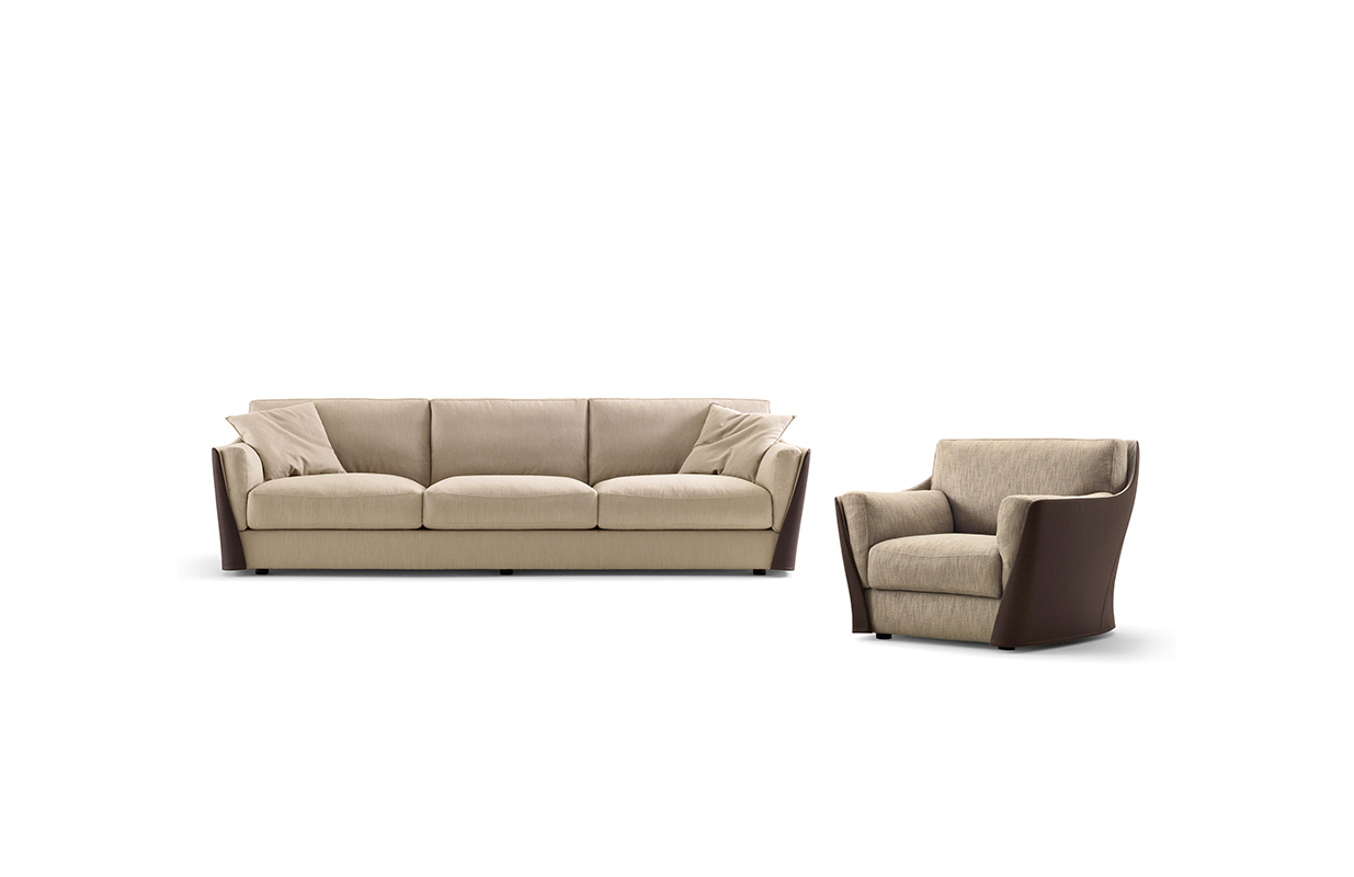 扶手椅和沙发的结构型钢的靠背,座位上的一个杨树胶合板和coldfoamed填充聚氨酯纤维覆盖。 靠背和坐垫上的鹅羽毛,最后在扩大聚氨酯的插入。 家具,完全可移动的织物或皮革,可以是一种颜色或两种颜色在皮革和内部外部织物或皮革。 一个在鹅的羽毛垫扶手椅和两个沙发的推荐.