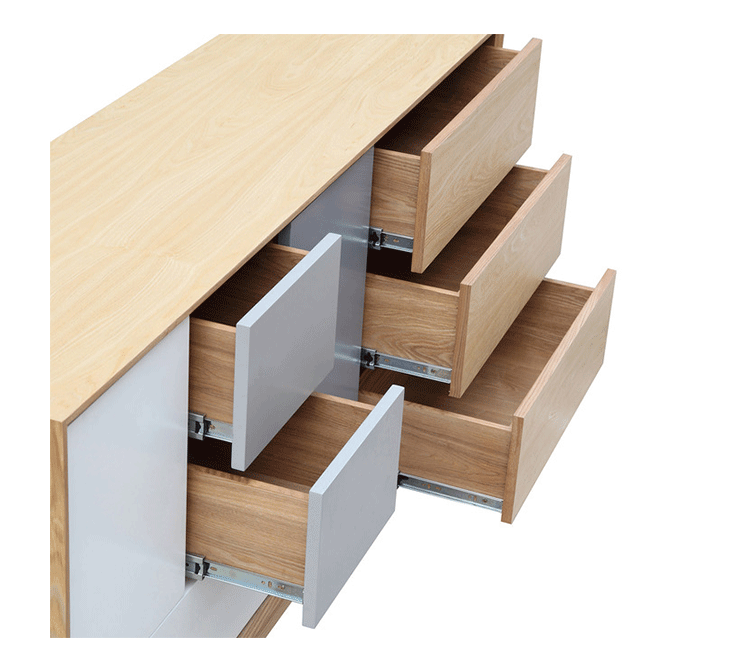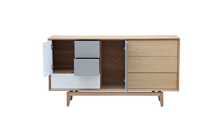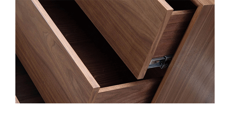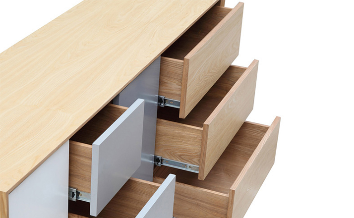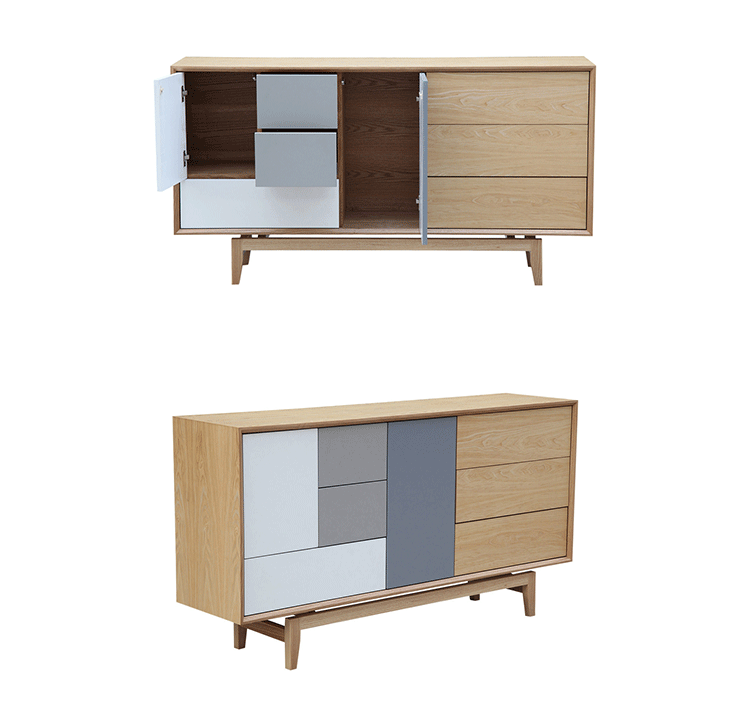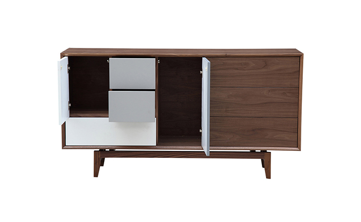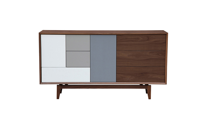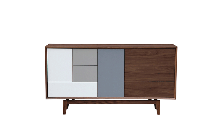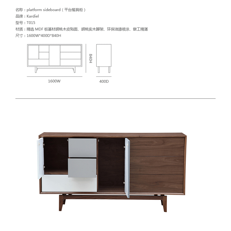 “platform sideboard(平台餐具柜)是Kardiel公司制作的经典实木家具,有着迷人的中世纪设计风格和当代形式巧妙融合,餐具柜主体平台由三个胡桃木单板抽屉和不同色调三聚氰胺组合面临抽屉和门组成。在20世纪50年代末,60年代初, Finn Juhl和 Arne Vodder 最先尝试胶木和天然木的组合运用,并流行至今。这是大胆的创新,他们结合传统的新鲜的新兴技术与现代主义的概念。制作采用精选MDF板基材胡桃木或水曲柳木皮贴面、实木脚架、环保油漆喷涂,做工精湛,品质一流。”