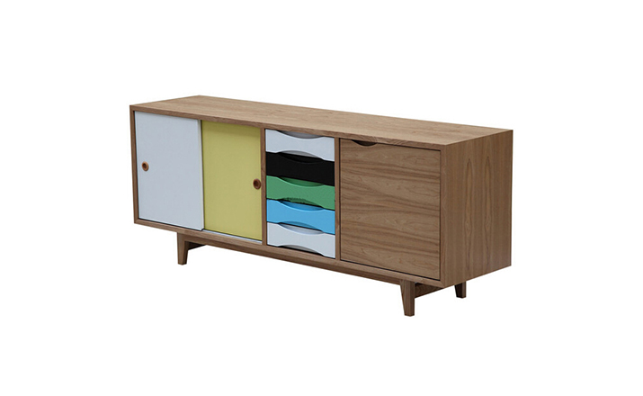 vodder sideboard(vodder餐具柜),Arne Vodder设计的作品,是Kardiel公司制作的经典实木家具,具有世纪中期的现代风格,加了少许复古现代主义色彩于其,微妙的局部拱曲线呈现在右手面对推拉门和5个拉出抽屉。在现代主义的存储家具上,Finn Juhl和Arne Vodder最先尝试胶木和天然木的组合运用。这是大胆的创新,他们结合传统的新鲜的新兴技术与现代主义的概念。制作采用精选MDF板基材胡桃木或水曲柳木皮贴面、胡桃实木或水曲柳实木脚架、环保油漆喷涂、做工精湛,是您理想的选择。