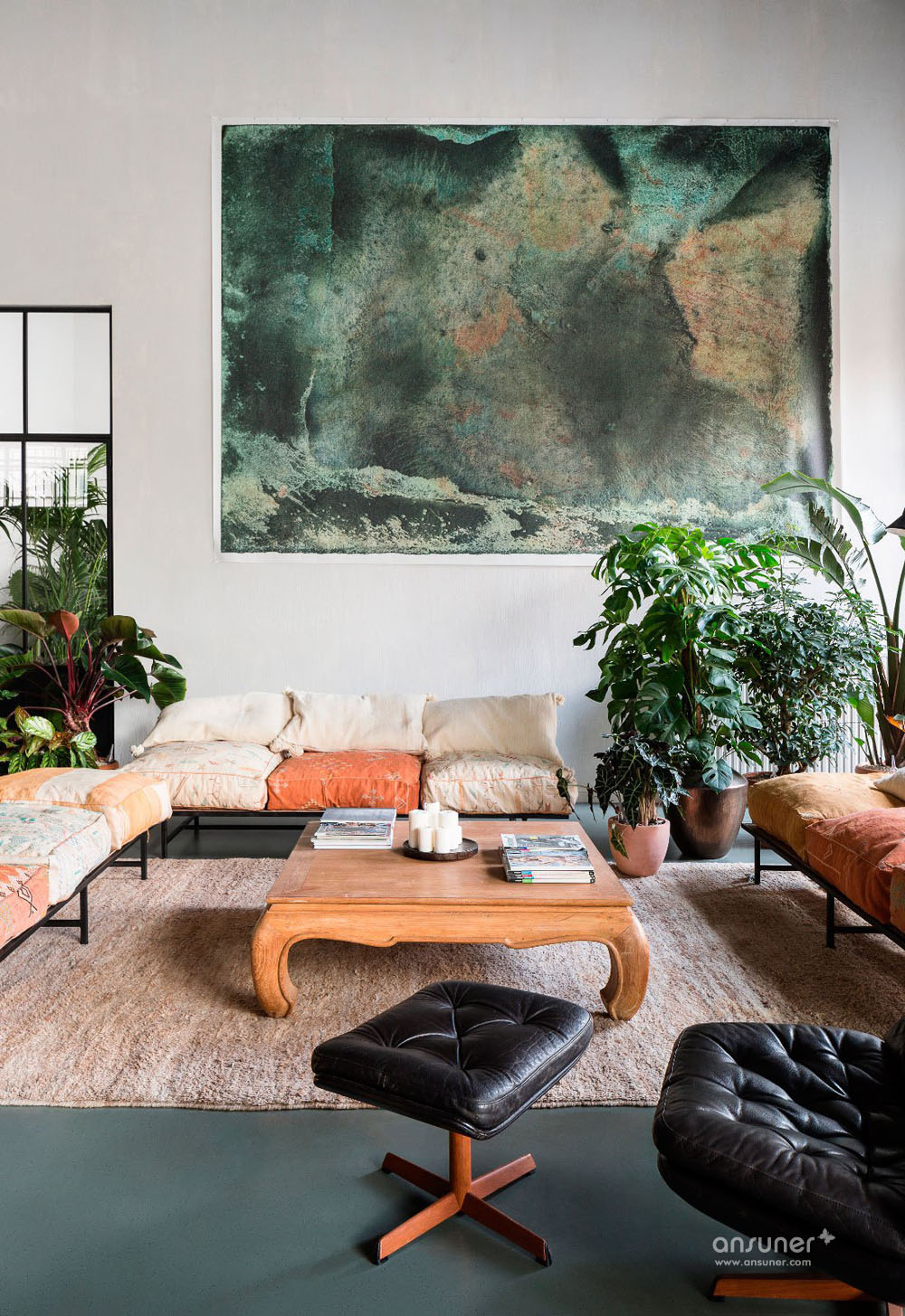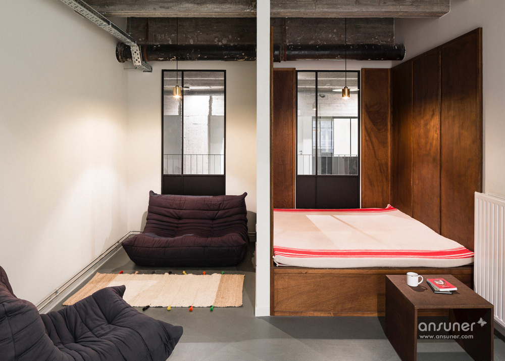 设计团队为这个空间定制设计了一些元素,比如由回收砖块和玻璃纤维制作的吧台。其它的如丹麦摩登傢俬、当代艺术作品和工艺品的完美混搭。漂亮的沙发来自比利时的家具品牌Journuit。