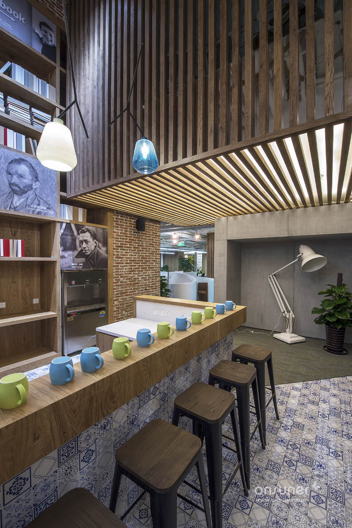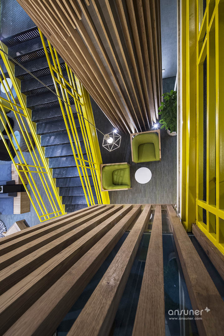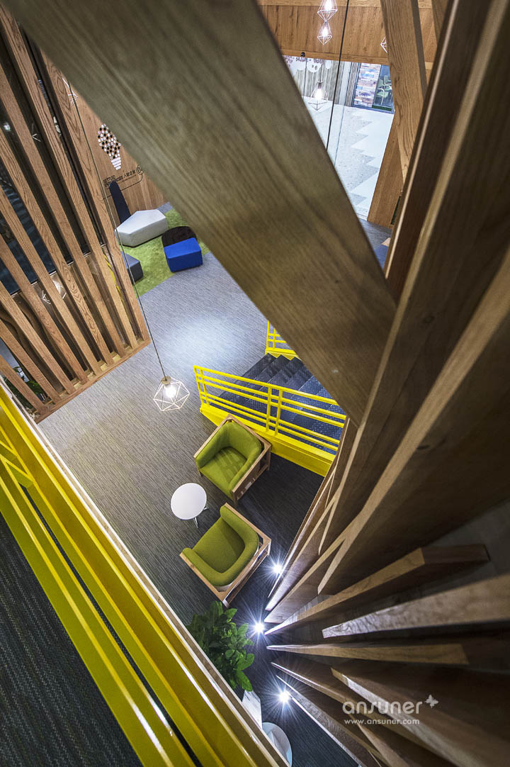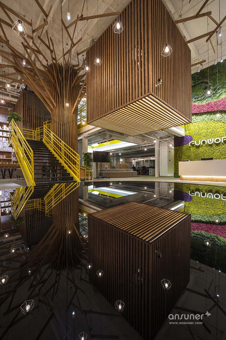 大量原生态木板、绿植墙的采用使整个空间接近原生态,营造出轻松、休闲的办公环境。过去毫无装饰白色承重柱,也被木制进行包裹,演化成了一个参天大树,给人大树底下好乘凉的感觉,树木象征着生长,万物欣欣向荣充满生命力。树枝向天花板伸展开来,一个个树屋垂挂其中将单调天花板加入了自然的生气。
